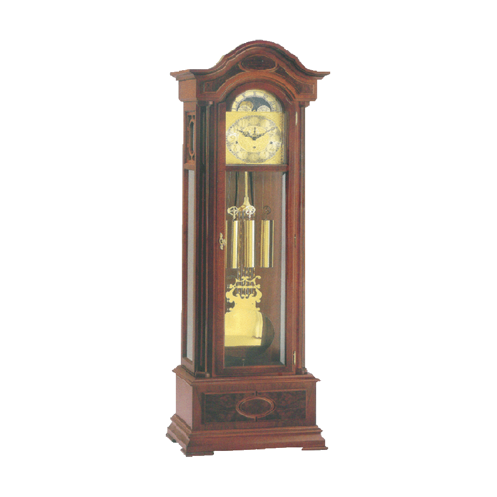材质及机芯:传统核桃木落地钟,斜面水晶玻璃门,侧面玻璃,秒表、月相显示,阿拉伯数字表盘,270mm七
